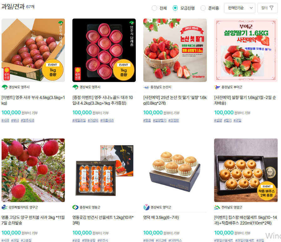 - 10만원 × 3개 지자체 분산(과일 + 정육 + 수산)