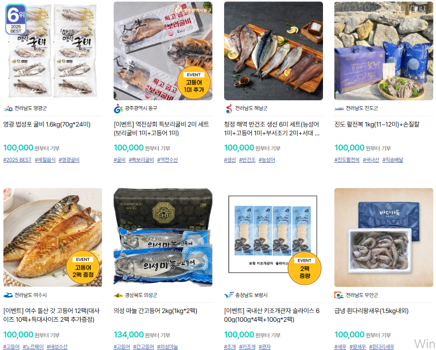 해안 지역 지자체의 대표 품목입니다. 전복·멸치·굴 세트 등은 양이 넉넉하고 신선도가 좋아 재구매율이 높습니다.