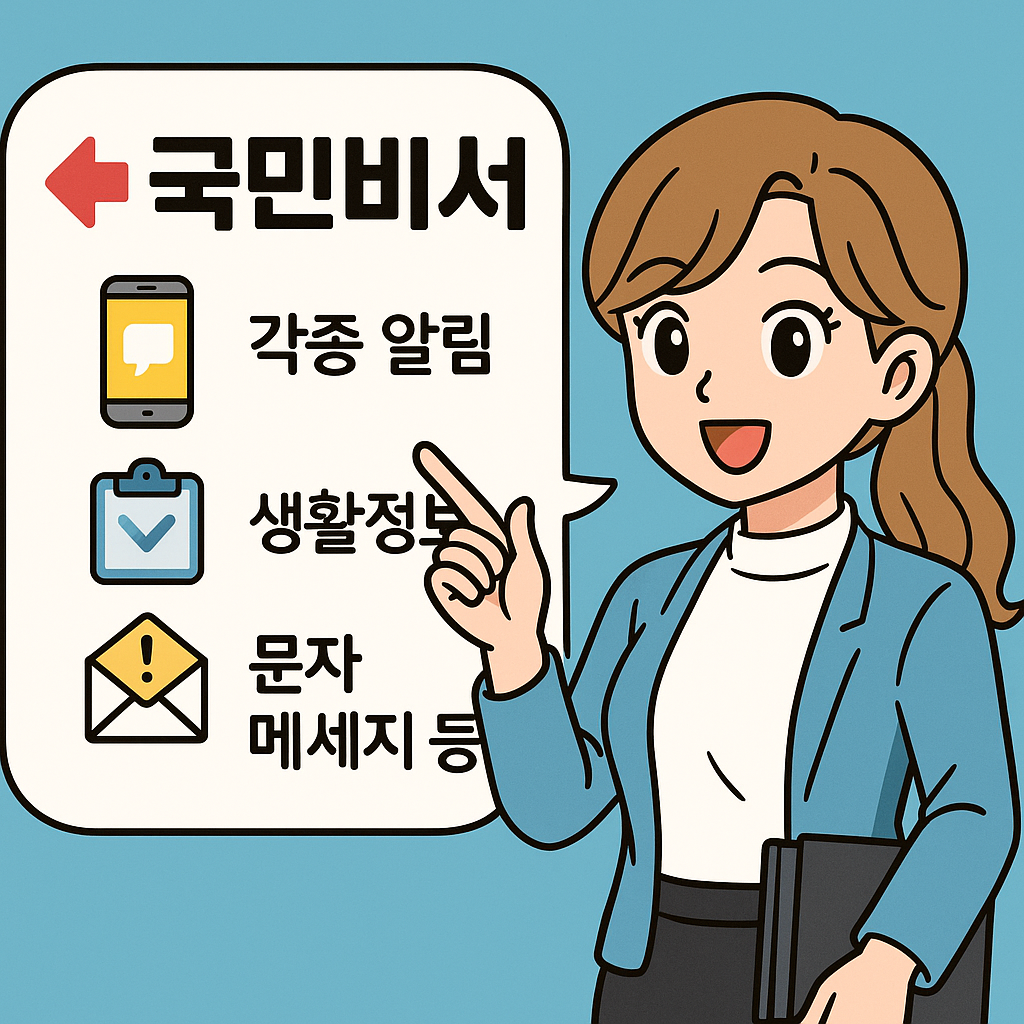 ‘국민비서’는 행정안전부가 제공하는 개인맞춤형 알림·상담 서비스입니다. 교통범칙금·건강검진·운전면허 갱신 등 90여 종의 주요 행정정보와 일정을 카카오톡·네이버·토스·금융 앱 또는 문자로 받아볼 수 있습니다.