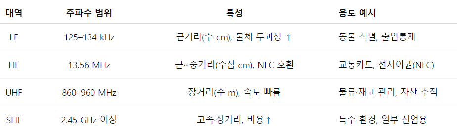 RFID 기술이란 전자태그(RFID 태그)와 판독기(리더기) 사이의 무선 통신을 통해 태그에 저장된 고유 ID나 데이터를 읽고 쓰는 기술을 의미합니다. RFID 판독기가 안테나를 통해 RF 전파(자기장)을 송출하면, RFID 태그가 이를 수신해 반도체 집에 전원은 공급합니다. 그 이후 칩 내부 메모리에 저장된 ID와 데이터를 변조하여 안테나가 반사하면, 다시 판독기가 반사파를 수신해 디코딩한 뒤에 태그 정보를 획득하는 방식으로 작동합니다. 각 주파수별 대역과 범위 및 용도는 아래에 이미지로 정리하였습니다.