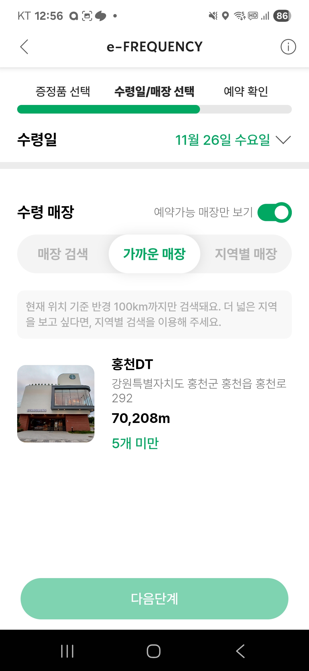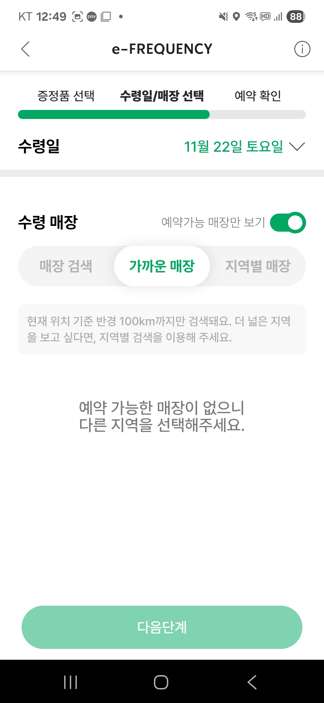 예약자의 위치 기준 반경 100km 내 매장이 우선 표시됩니다. 문제는 인기 굿즈 예약일엔 대부분 ‘예약 가능한 매장이 없습니다’ 메시지가 떠요.