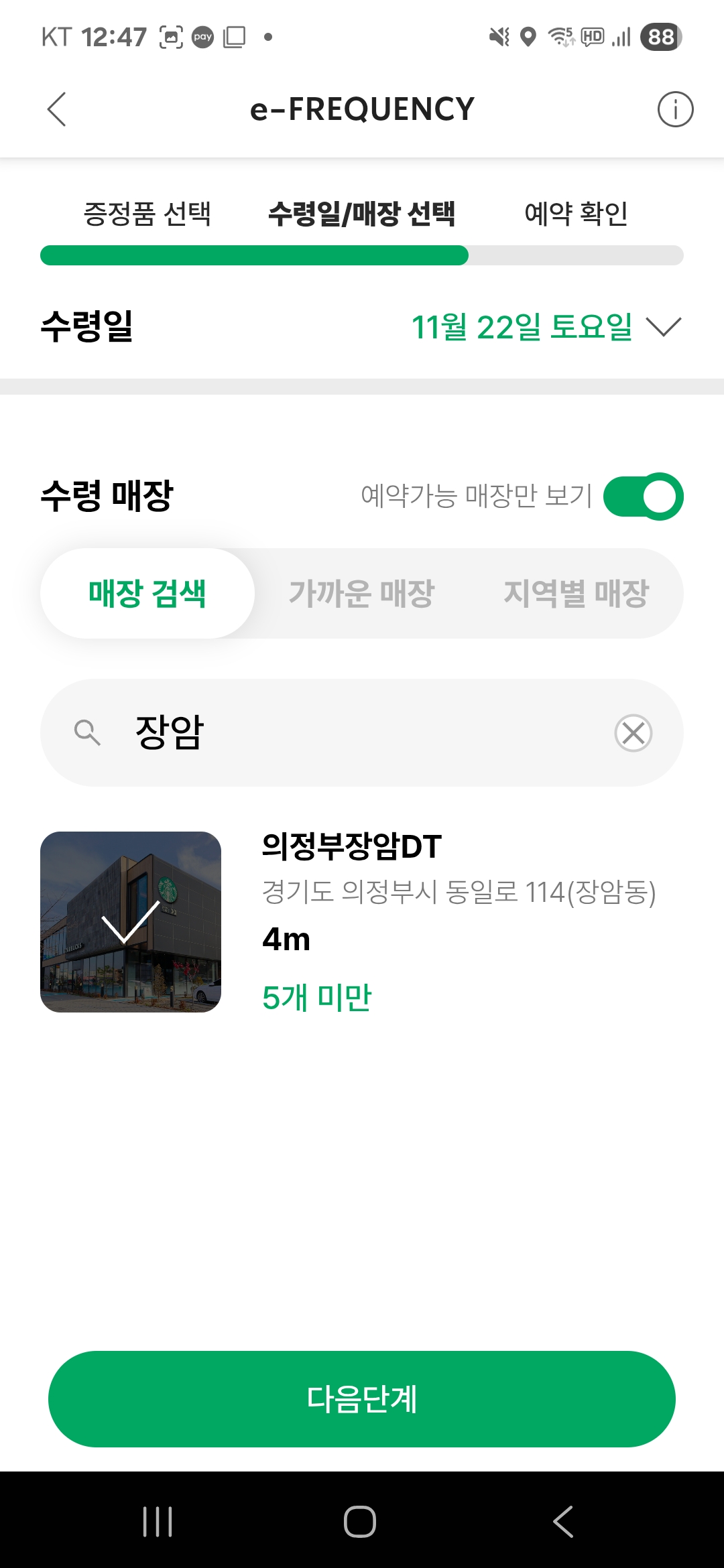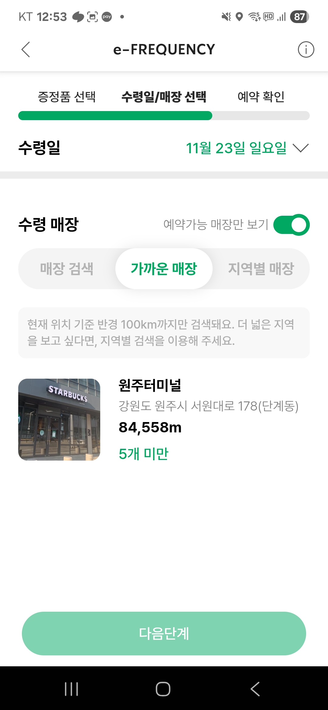 스타벅스의 e-프리퀀시 예약 방식은 다음 3단계로 이루어져 있습니다.
