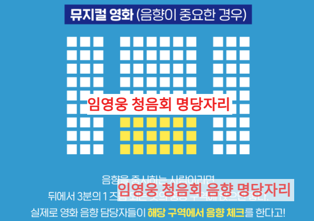 일반 상영관 기준으로 세로(앞뒤) 기준 뒤에서 1/3 지점, 가로 기준으로 정중앙 블록 근처가 균형 잡힌 소리를 가장 안정적으로 제공합니다. 특히 보컬 중심 음악의 명료도와 저역 타격감이 균형을 이루기 쉽습니다.
