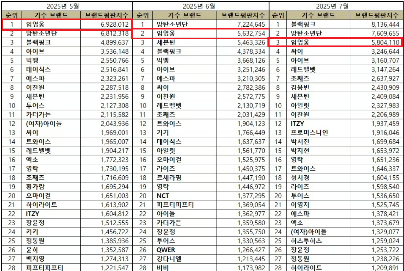 7월 발표에서는 블랙핑크, 방탄소년단 등이 그룹으로 상위권에 올랐고, 임영웅님은 그룹을 제외한 순수 솔로 가수 중에서 가장 높은 평가를 받았습니다. 이는 컴백 직전 팬덤의 응집력과 기대감이 실질적 점수로 반영된 순간입니다.