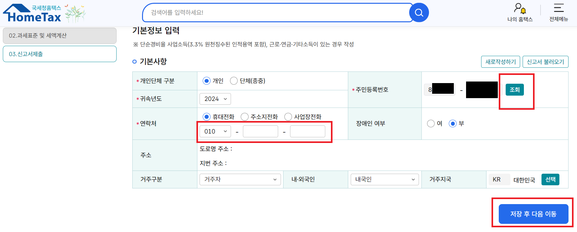 신고 메뉴 이동: '세금신고' > '종합소득세' 메뉴를 선택합니다. 이후 다음 그림과 같은 순서로 진행됩니다. 우선 기본정보 입력합니다.