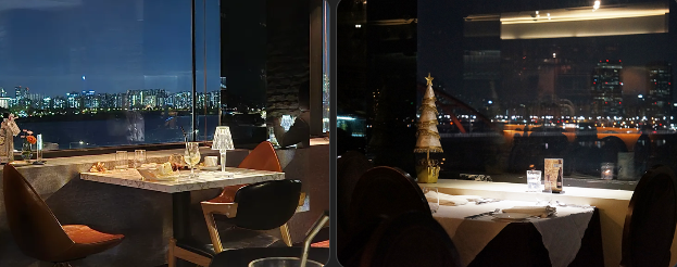 가능하다면 예약 시간을 18:00~19:00 사이로 잡아, 저녁 분위기와 완전히 자리 잡은 야경을 모두 즐길 수 있도록 구성하는 것을 추천합니다. 또한 창가석이 아니더라도 통창 구조가 많은 곳은 전반적으로 뷰가 좋아 전체 좌석의 만족도가 높은 편입니다.