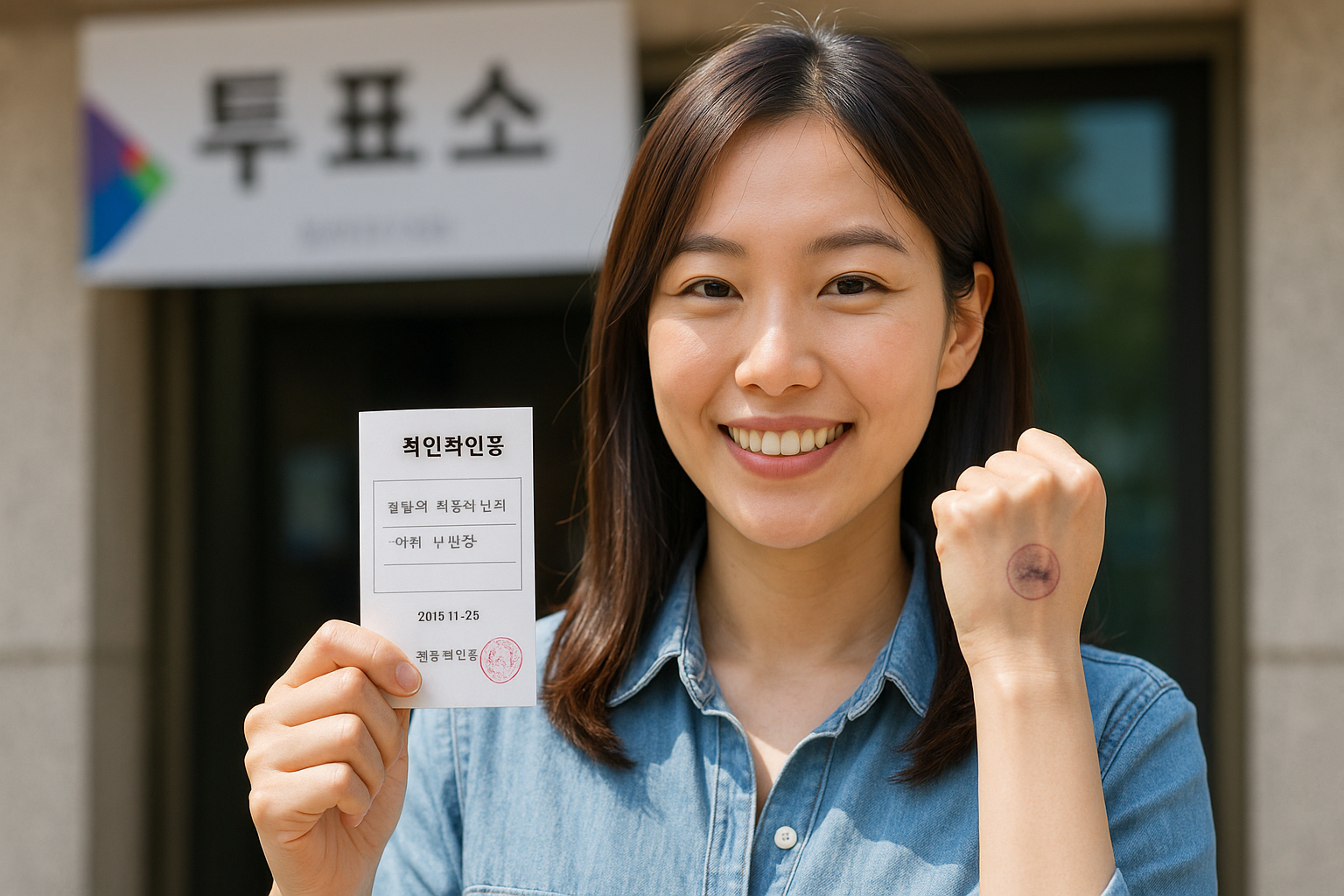 • 투표소 외부에서 촬영: 투표소 밖에서 투표 확인증이나 손등에 찍은 기표 도장을 배경으로 인증샷을 촬영하세요.