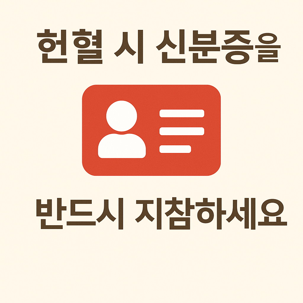 - 신분증: 헌혈자는 본인 확인을 위해 유효한 신분증(주민등록증, 운전면허증, 여권 등)을 지참해야 합니다.