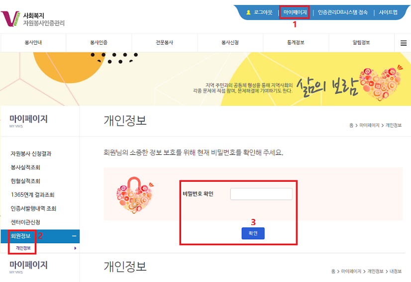 - 나의자원봉사 → 회원정보(부가정보) → ‘VMS 실적연계’ 동의