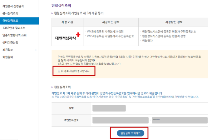 - ‘헌혈실적 조회’ 버튼 클릭 시 자동으로 대한적십자사 헌혈정보시스템에서 실적 불러오기