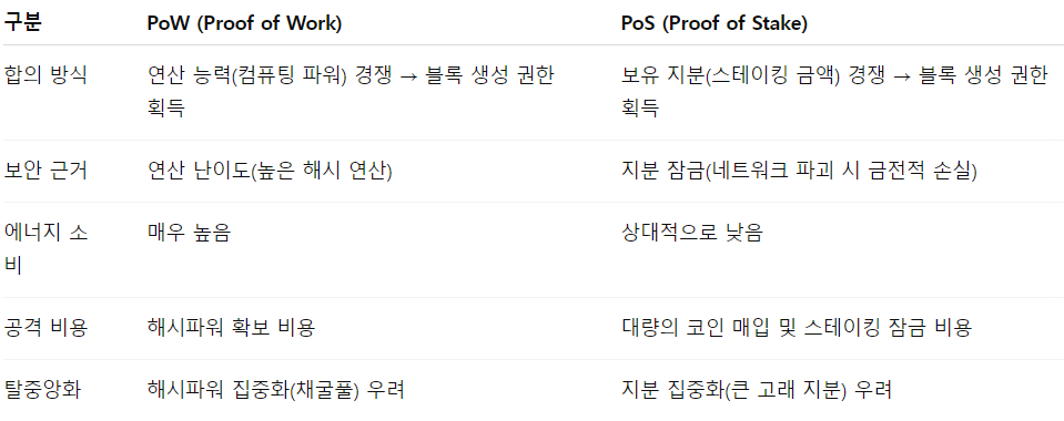PoW의 장점은 높은 보안성과 검증된 안정성입니다. 비트코인을 공격하기 위해서는 51% 이상의 블록 점유가 필요한데 사싱상 이는 불가능한 일이라 할 수 있습니다. 단점은 높은 에너지 소비량과 확장성의 한계가 있습니다. 전력 소비량이 커서 국제적으로 문제가 되고 있으며 트랜잭션 과부하가 자주 발생합니다. 또한 소규모 채굴업체가 진입하기 어려운 한계도 있습니다.